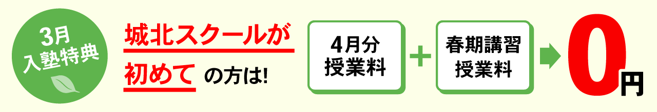 ※別途、テキスト代・テスト代・諸経費が必要となります。※個別指導コースは通常月の授業料が1ヶ月だけ1コマ分無料となります。※春期講習特典は集団授業のみ適用となります。※高校生、浪人生は対象外です。※過去に在籍していた方、講習のみ受講された方には別途割引特典があります。※適用条件がございます。詳しくはお問い合わせください。
