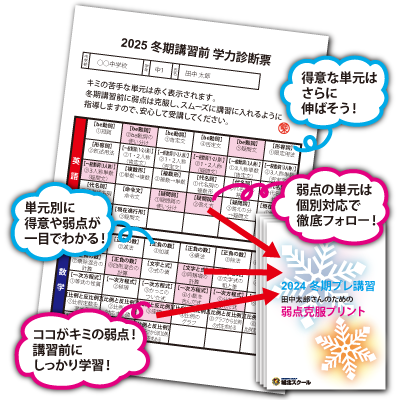 テストの結果を基に「冬期講習前 学力診断票」が作成されるので、弱点克服ポイントがひと目でわかります。さらに生徒一人ひとりの学力特性に合った「キミだけの弱点克服プリント」を使って、わからないところ・不安なところを徹底的にフォローします。