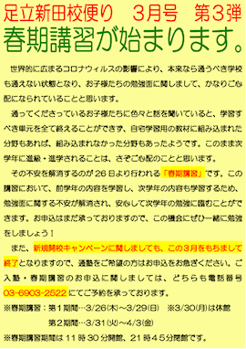 私は、中学2年生の年末に入塾しました。そのころ自分の中にもうすぐ受験だという意識はなく、甘えた生活をしていました。自主学習(自習)も目的や、やることをはっきり決めず、ダラダラと気の抜けた勉強をしていました。しかしそんな中、I先生に注意され意識が変わりました。夏休みには夏期講習前にも自習にいき、遅くはなったものの点数の取れる教科、苦手なものがはっきりとしてきました。そして新年になってからはとにかく塾に来て多くの時間を勉強に費やしました。足立新田校の中で1番2番を争うくらいやったかと言われればもっと努力している人はいたし、先生たちから見てどんな感想だったかは分かりませんが、少なくとも今までの自分の中でいちばん時間を費やし、努力していたと思います。国語を教えてくれたS先生は自分の解き方と似ていて分かりやすく、数・理のN先生は分かりやすく、理科は間違えた問題はまとめるようにアドバイスされて実行したら、それまでは50点が普通だったのが都立本番では90点まであと1歩くらいまで点数が跳ね上がりました。英社を教えてくれたI先生は授業が分かりやすく、苦手だったこの2科目も抵抗なくできるところまで持っていけました。このようなすばらしい先生たちのご指導と、多くの時間を受験勉強に費やしたおかげで都立本番は不安も緊張もせず、自己採点をしてみると普段の20〜30点上をいく過去最高点をとることができました。ここでは取り上げられなかった直前対策や、サンデースクールでお世話になった先生方、足立新田校というすばらしい環境を提供してくださった先生方に心から深い感謝を申し上げます。あまりチャレンジをした受験ではありませんでしたが、人生初の受験を合格という形で終わらせることが出来ました。そして何より、自分は思っている以上に努力ができるのかもしれないと気付かせてくれました。受験は終わりましたが、それは高校生活の始まりともとれるので、気を抜かずに頑張っていきたいと思います。