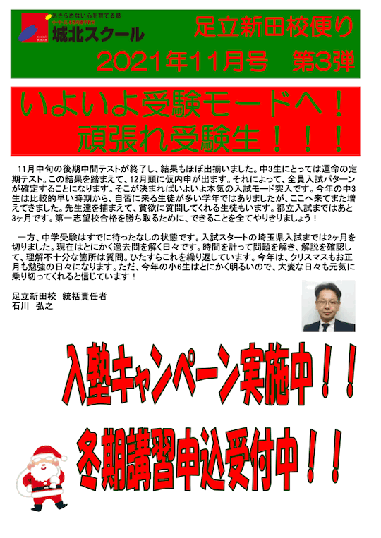 城北スクールの先生方へ、ほんの数か月でしたが、僕の受験勉強を支えてくださり、本当に感謝しています。このまま高校生活もくじけずに頑張っていきます。 -
