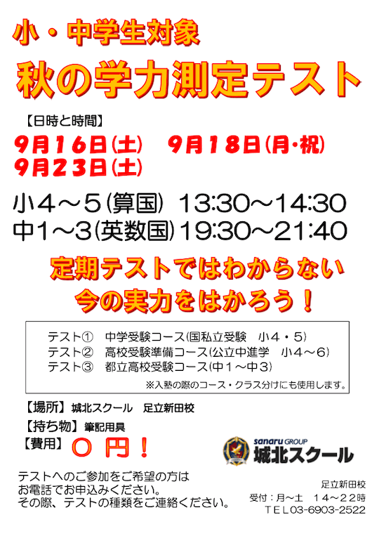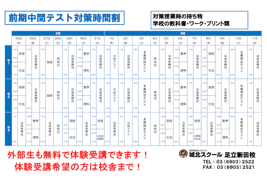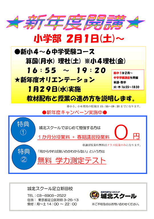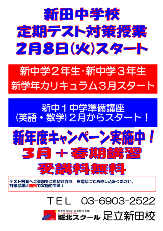 城北スクール足立新田校は、新田学園小・中学校第一校舎横の坂を下りまっすぐ進んだところにあります。校舎の前は、いつも生徒の皆さんの通学路になっているため授業がないときでも気軽に質問などをすることができます。校舎の雰囲気は日の光が常に差し込み、また生徒の皆さんが「元気」なためとても明るいです。「地域密着」を合言葉に、授業がない日でも校舎に来やすい環境づくりを心がけています。中学・高校受験、各定期テスト対策、お困りなことがありましたらお気軽に校舎までお問い合わせください。