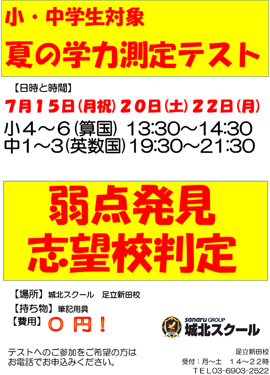 私が城北スクールに通い始めたのは、今から1年前の冬頃。そんな私の受験物語をお話しします。入塾当時の成績は「普通」。頭が悪い訳でもなく、良いということもありませんでした。得意教科もなく、それこそ「普通」でした。入塾して半年。「やったー!月例テストで過去最高偏差値だ!」夏頃、私の成績は「ぐん」と上がりました。しかし、私には得意教科がない!苦手な教科で転んでも、カバーできる教科がないとまずい!と思い、成績の推移のグラフを見てみると数学は常に高い方かも。と気がつき、数学を特に頑張ってみることにしました。そして、内申のため定期テストに力を入れていたせいか、入塾して10ヶ月の秋頃、私は、都立そっくり模擬で過去最低偏差値をとってしまい、このままでは合格が難しいという状況に陥ってしまいました。そして著しく悪い点数だったのは社会と理科。数学はそれなりに良かったものの、都立には社会と理科が必要なため、都立を諦めて私立に行くことも考えました。そんなとき、先生に「社会と理科なら今からでもなんとかなるから頑張ろう!」と言われ、ピンチだった私は素直に先生の言うことを信じて毎日自習室へ行くようになりました。そして2月上旬。冬期講習と、毎日自習室に行っている成果が現れ、偏差値が爆上がりしました。特に上がったのは数学と理科。夏頃に数学を頑張り始めたもののあまり上がらなかったため、諦めかけていましたが、数学は好きだったため頑張れました。そしてなによりビックリなのは理科!今までは嫌いだった教科が2月には1番の得意科目となりました。数学・理科担当のN先生の力は本当にすごいなと思いました。そして、2月中旬。どの教科も安定して点数がとれるようになり、数学と理科は80点は当たり前。良ければ90点にも届くようになりました。「これで安心して受験できるなー」と思いました。そして迎えた都立本番。国語は良く英語と社会はあまり納得のいかない結果でしたが、許容範囲内。理科は80点を超えて良。そして数学。「あれ?」今までの結果からは考えられないまさかの60点台。不安と焦りでいっぱいでした。今年は私の志望校の倍率が都内で4位だったということもあり、「もうダメだ」と思い泣きながら家に帰りました。そしてドキドキの合格発表。私はなんと、合格していました!発表の朝、塾に報告に行ったとき先生方もとても喜んでくれて徐々に実感がわいてきました。私が今回の受験で学んだことはたくさんあります。まず、努力は必ず自分の力になるということ。そして支えてくれる人がいたからこそ合格できたということ。確かに自分の力で合格したものの、それまでに家族や、塾や学校の先生方の手厚いサポートがあったからこその合格です。その他にもたくさんあるけれど、今回はここまで!受験を控えている生徒のみなさん。夢を実現できるようがんばってください!応援しています!