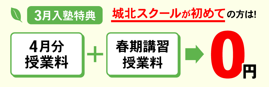 ※別途、テキスト代・テスト代・諸経費が必要となります。※個別指導コースは通常月の授業料が1ヶ月だけ1コマ分無料となります。※春期講習特典は集団授業のみ適用となります。※高校生、浪人生は対象外です。※過去に在籍していた方、講習のみ受講された方には別途割引特典があります。※適用条件がございます。詳しくはお問い合わせください。