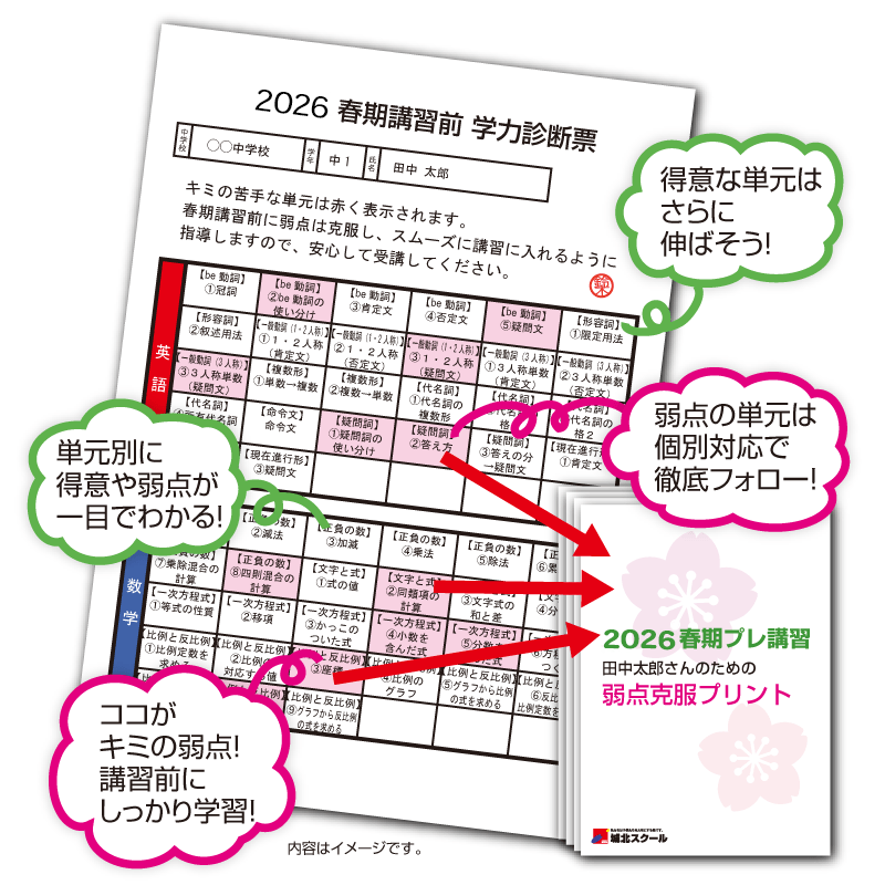 テストの結果を基に「春期講習前 学力診断票」が作成されるので、弱点克服ポイントがひと目でわかります。さらに生徒一人ひとりの学力特性に合った「キミだけの弱点克服プリント」を使って、わからないところ・不安なところを徹底的にフォローします。
